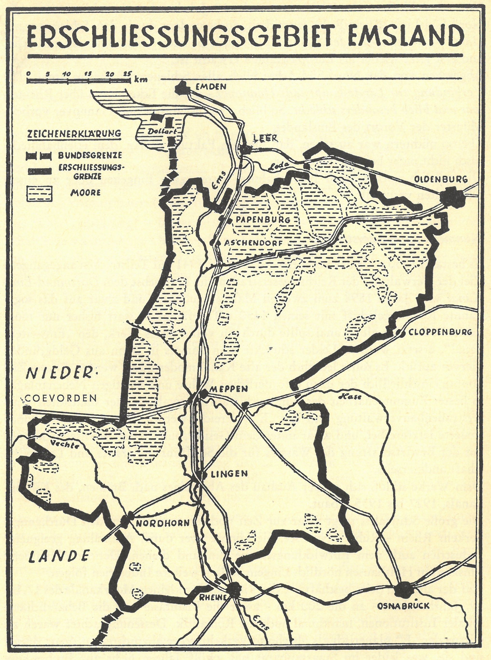 Ein starkes Argument der Befürworter war die Vernachlässigung der Moorgebiete, übrigens auch in der Niedergrafschaft Bentheim. Während in den Niederlanden seit Jahrhunderten kultiviert worden war, lagen Moor und Heide diesseits der Grenze als Ödland ungenutzt – in einer Zeit des Hungers und der Not. Unter Landrat Dr. Rudolf Beckmann gründete sich der Bentheimer Grenzlandausschuß am 12.2.1947. Alle Regierungspräsidenten und die Landräte der 16 betroffenen Kreise im deutsch-niederländischen Grenzgebiet versammelten sich in Bentheim und organisierten fortan den Protest – aber auch die Verständigung mit dem Nachbarland. Die Verhandlungen endeten mit dem deutsch-niederländischen Ausgleichsvertrag vom 8.4.1960, der die Rückgabe der 1949 unter niederländische Verwaltung gestellten Grundstücke an die Bundesrepublik Deutschland und den Verlauf der gemeinsamen Grenze regelte. Damit war ein erster Schritt zum jahrhundertealten, freundschaftlichen Verhältnis von Deutschen und Niederländern getan. Die Aufgabe der Ödlandkultivierung war durch die Grenzbedrohung deutlich hervorgetreten. Die niederländischen Gebietsforderungen waren somit ein Geburtshelfer des Emslandplans.