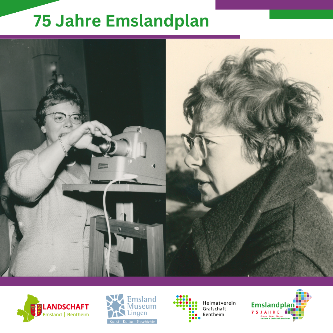 Wenn man wie beim Emslandplan anfängt, mit Pflügen in die Tiefe zu gehen und die Landschaft komplett umzugestalten, stellt sich die Frage, wie man mit den dort bereits befindlichen menschlichen Spuren umzugehen hat. Von Anfang an war bei der Emsland GmbH mitgedacht worden, die archäologischen Zeugnisse zu bewahren. Deshalb hatte man mit Dr. Elisabeth Schlicht eine Person angestellt, die in allen vier damals noch sogenannten „Emslandkreisen“ archäologische Denkmäler sichern sollte. Ab 1955 war sie ständige Vertreterin des Landesarchäologen. Schlicht war 1914 in Sögel geboren, studierte Ur- und Frühgeschichte in Göttingen, Marburg, München und Kiel und war ab 1948 Heimatpflegerin im Kreis Aschendorf-Hümmling, ab 1950 Geschäftsführerin des dortigen Heimatvereins und wurde 1953 schließlich Geschäftsführerin des gerade gegründeten Emsländischen Heimatvereins (ab 1967 Heimatbund). In dieser Funktion hat sie mit Weitsicht die Kulturarbeit vorangebracht. Dazu gehören u.a. das Emsland-Jahrbuch sowie die Einrichtung eines (wenn auch nur kurzzeitigen) Museums über die Geschichte des Emslandes im Meppener Gymnasium („Heimathaus Emsland“, ab 1958). Sie setzte sich darüber hinaus für den Erhalt der kulturgeschichtlich wertvollen Bauten und Gegenstände ein. Denn mit der Erschließung verschwanden historische Bauernhöfe und Bauern verkauften ihre alten Truhen an Antikhändler. Sie hatte den Blick für Kultur und Historie und dokumentierte diesen Verlust des kulturellen Erbes. Zudem machte sie in zahlreichen Vorträgen das Emsland über die Landesgrenzen hinaus bekannt und sorgte somit für die touristische Entwicklung der Region. 1963 verließ Schlicht, nachdem der Geschäftsführer der Emsland GmbH, Lauenstein, in den Ruhestand getreten war, das Emsland. Sie fand eine neue Wirkungsstätte am Landesmuseum in Hannover. Schlicht verstarb 1989 in Werlte. Der Emsländische Heimatbund und die Emsländische Landschaft werden in den Jubiläumsjahren 2025/26 Schlicht eine Wanderausstellung widmen und ihre Leistungen rund um Denkmal- und Naturschutz sowie in der Kulturarbeit herausstellen.