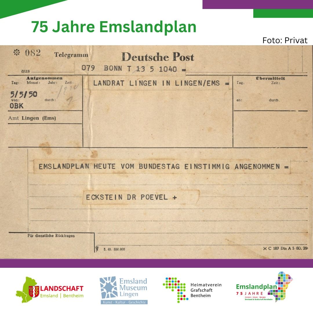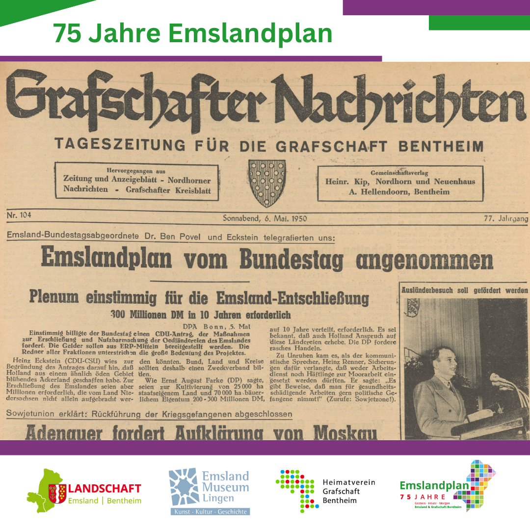 Am 5. Mai beschloss der Deutsche Bundestag einstimmig den Antrag der Abgeordneten Heinrich Eckstein und Ben Povel über die „Erschließung der Ödländereien des Emslandes“. Damit war der Emslandplan geboren. 2025 und 2026 wird das Jubiläum im Emsland groß gefeiert. Dieser Beitrag bildet den Auftakt einer Social-Media-Serie, die von der Emsländischen Landschaft, dem Emslandmuseum Lingen (@emslandmuseum) und dem Heimatverein der Grafschaft Bentheim (@grafschafterheimatverein ) eingespielt wird. Sie stimmt auf das 75. Jubiläum des Emslandplanes ein. Mehr Infos über 75 Jahre Emslandplan: https://www.emslaendische-landschaft.de/news/75-jahre-emslandplan-%E2%80%93-sei-dabei.html
