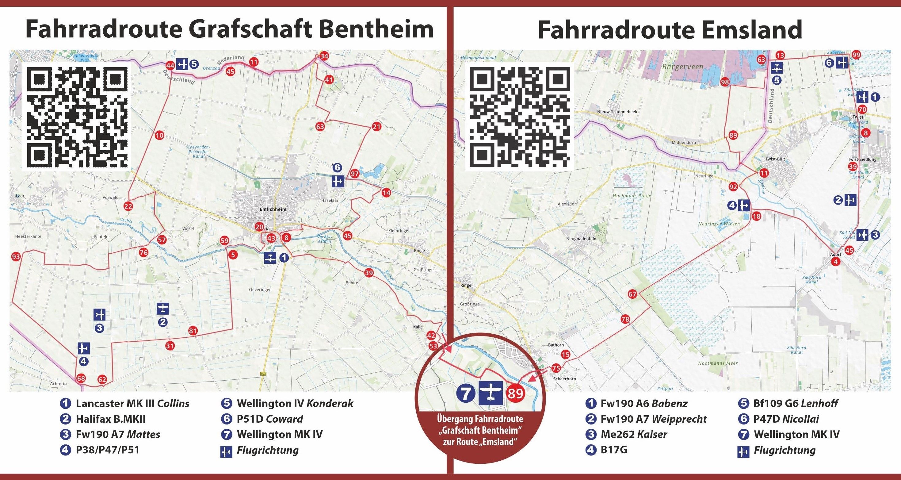 Die Absturzstellen sind so ausgewählt worden, dass sie eine Route im Emsland (Twist) und eine in der Grafschaft Bentheim (Emlichheim) bilden, die mit dem Fahrrad erkundet werden kann.